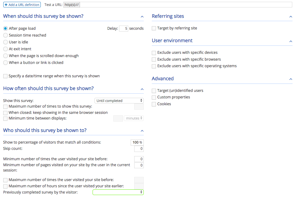 These are just some of the different triggers to deploy your survey. Which of your website visitors should receive your survey? Current customers, non-purchasers only, just Android users? It's up to you, but remember highly targeted surveys work best, the more relevant your survey is, the better the responses typically are.